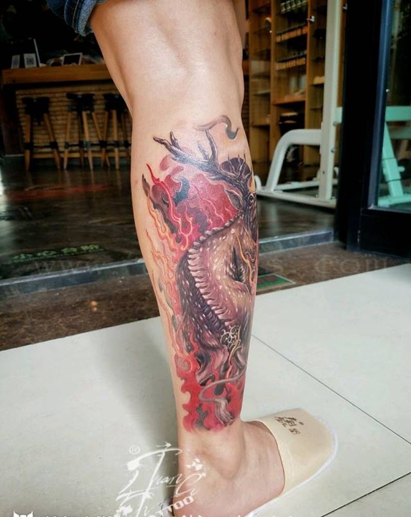 当前位置: 首页 >新疆乌鲁木齐市纹身店-新疆乌鲁木齐天刺良肌纹身纹身图案>天禄纹身图片_腿部欧美写实天禄图纹身图案