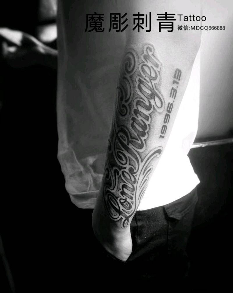 当前位置: 首页 >新疆乌鲁木齐市纹身店-魔彫刺青纹身图案>花体字纹身图片_手臂花体字英文黑白纹身图案