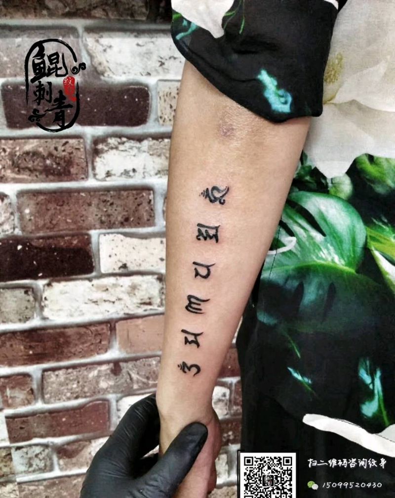 当前位置: 首页 >新疆乌鲁木齐市纹身店-鲲刺青纹身工作室纹身图案>六字箴言纹身图片_手臂传统字符图腾简约成品纹身图案