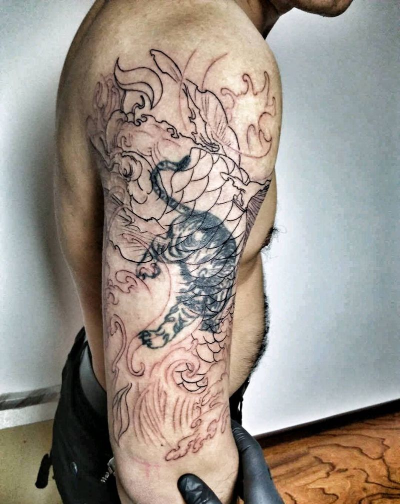 • T网红王老大花腿龙纹身图片_腿部新传统纹身图案
