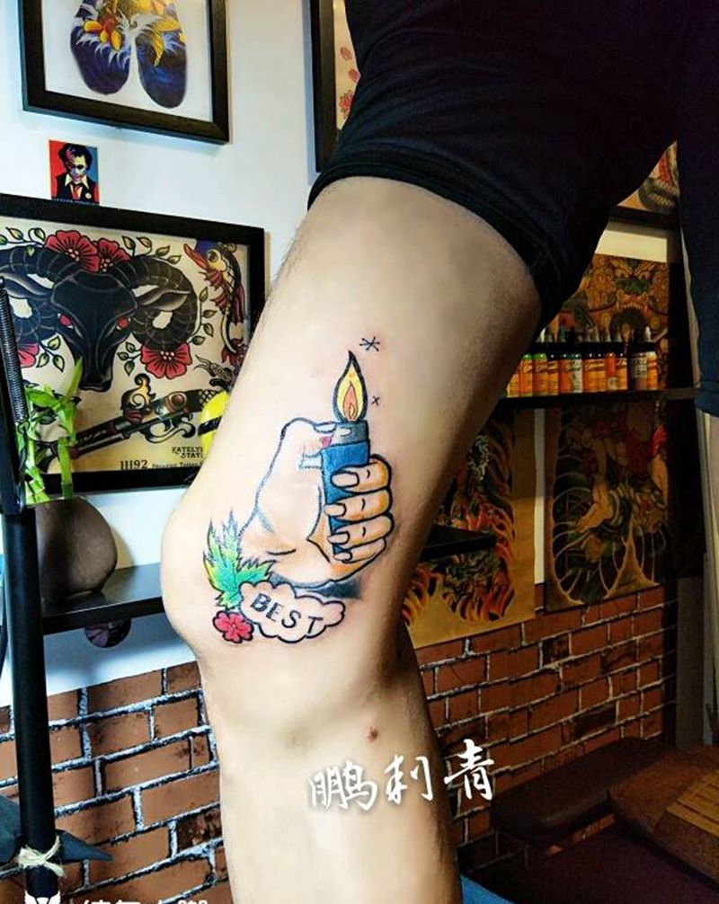 • T包小腿吹火男+阿多福纹身图片_腿部老传统新传统吹火男阿