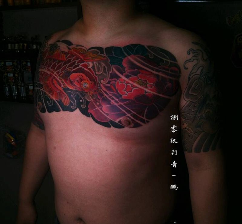 鲤鱼牡丹花胸纹身图片_胸部新传统纹身图案
