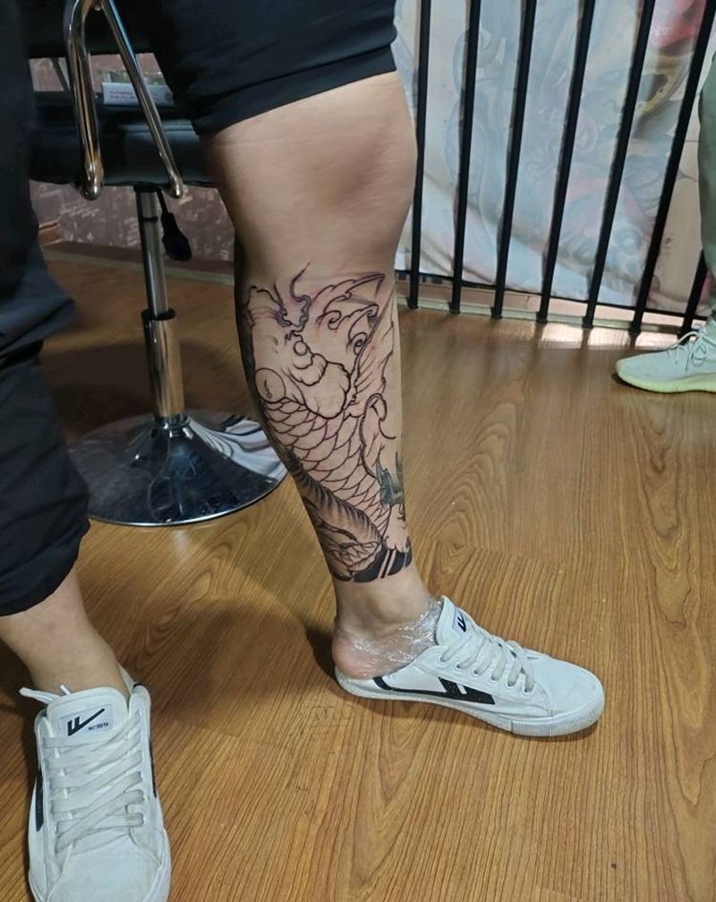 • T网红王老大花腿龙纹身图片_腿部新传统纹身图案
