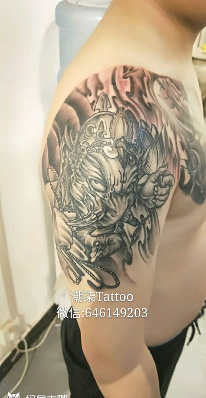 当前位置: 首页 >新疆乌鲁木齐市纹身店-潮柒刺青纹身图案>象神与唐狮半胛纹身图片