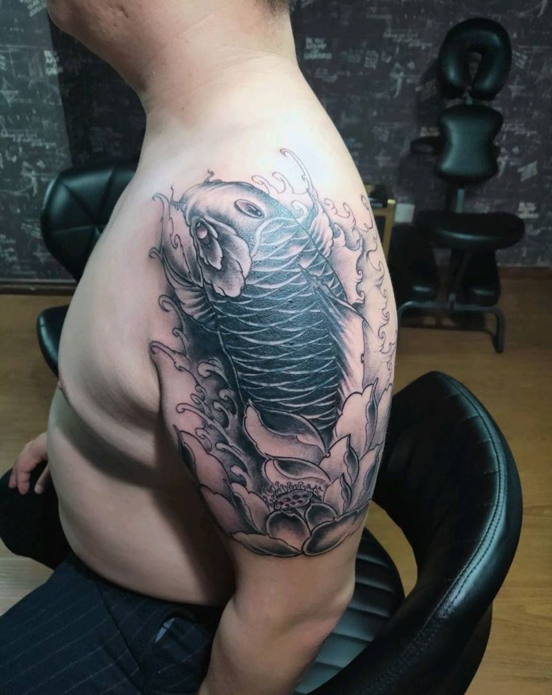 大臂锦鲤纹身图片_肩部手臂新传统纹身图案