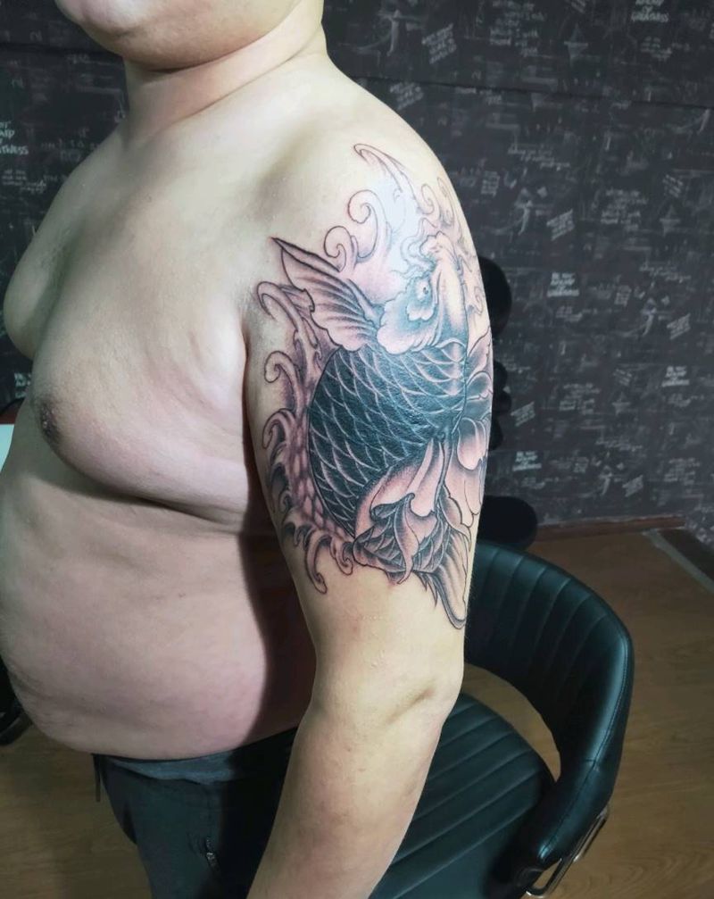 大臂锦鲤遮盖纹身图片_手臂新传统纹身图案