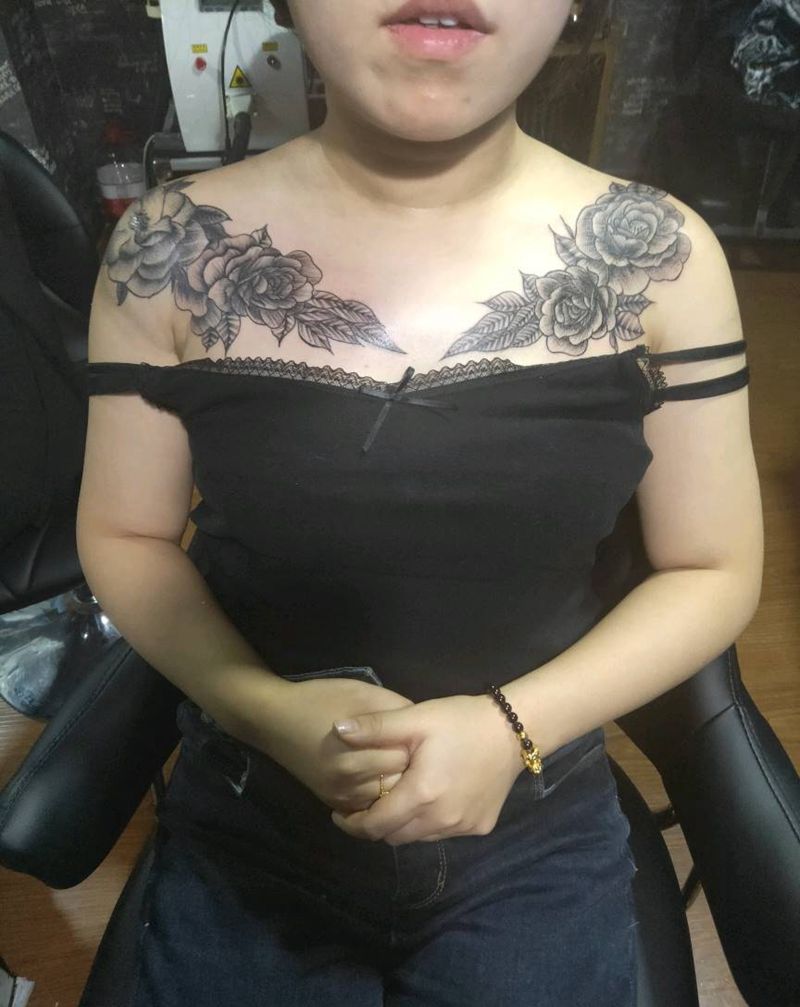 花胸素花纹身图片_胸部肩部点刺纹身图案
