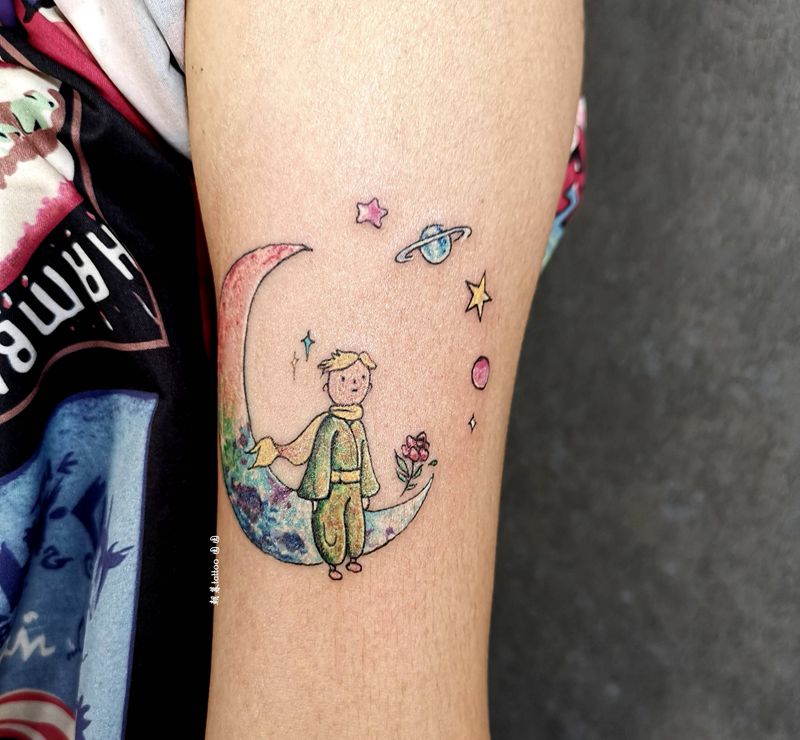 当前位置: 首页 >新疆博尔塔拉蒙古自治州纹身店-朝暮刺青纹身图案>小王子与玫瑰纹身图片_手臂New School水彩小王子纹身图案