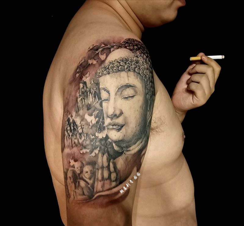 众僧拜佛纹身图片_手臂新传统点刺佛众僧拜佛银杏叶纹身图案