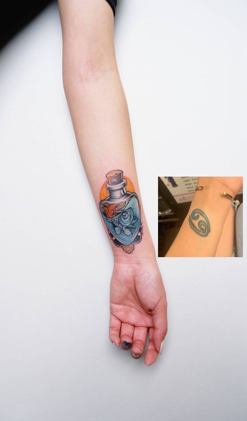 手腕龙鱼遮盖纹身图片_手部New School纹身图案