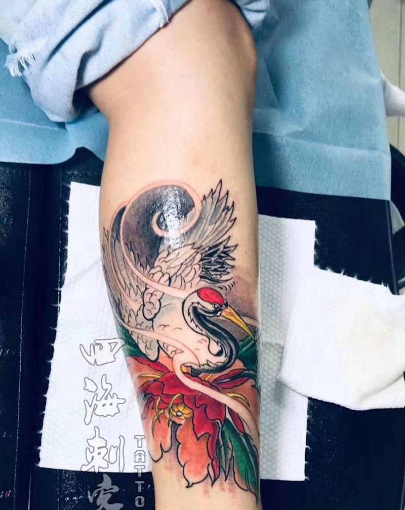 小腿仙鹤纹身图片_腿部新传统纹身图案
