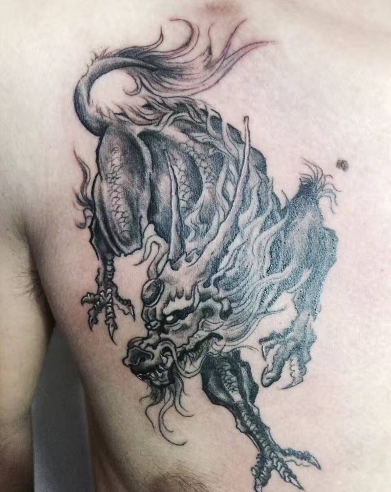 当前位置: 首页 >新疆巴音郭楞蒙古自治州纹身店-峯刺青Tattoo studio纹身图案>麒麟纹身图片_成品胸部传统动物纹身图案