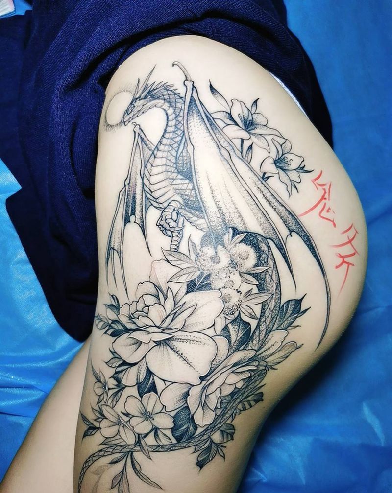 • T网红王老大花腿龙纹身图片_腿部新传统纹身图案