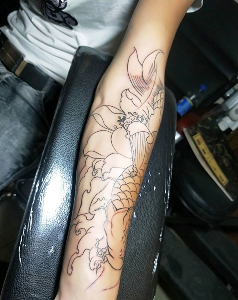 当前位置: 首页 >新疆巴音郭楞蒙古自治州纹身店-鬼斧·tattoo·刺青纹身图案>锦鲤纹身图片_手臂新传统纹身图案