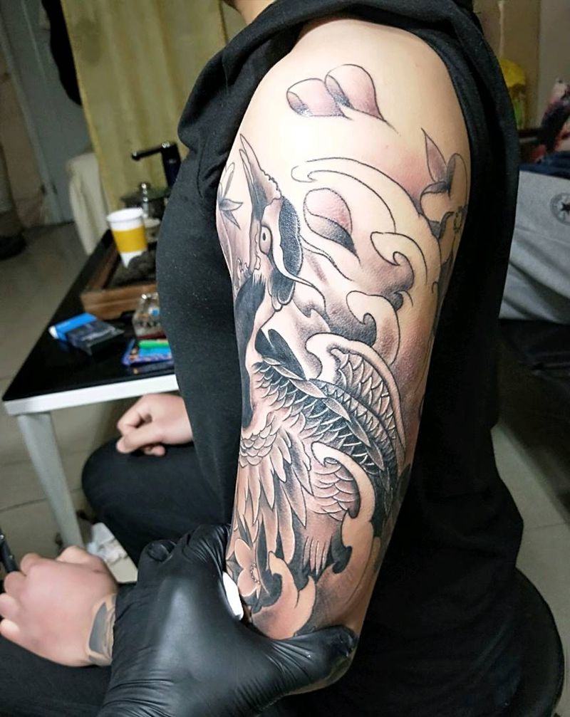 当前位置: 首页 >新疆巴音郭楞蒙古自治州纹身店-鬼斧·tattoo·刺青纹身图案>丹顶鹤拼接小臂纹身图片_手臂新传统纹身图案