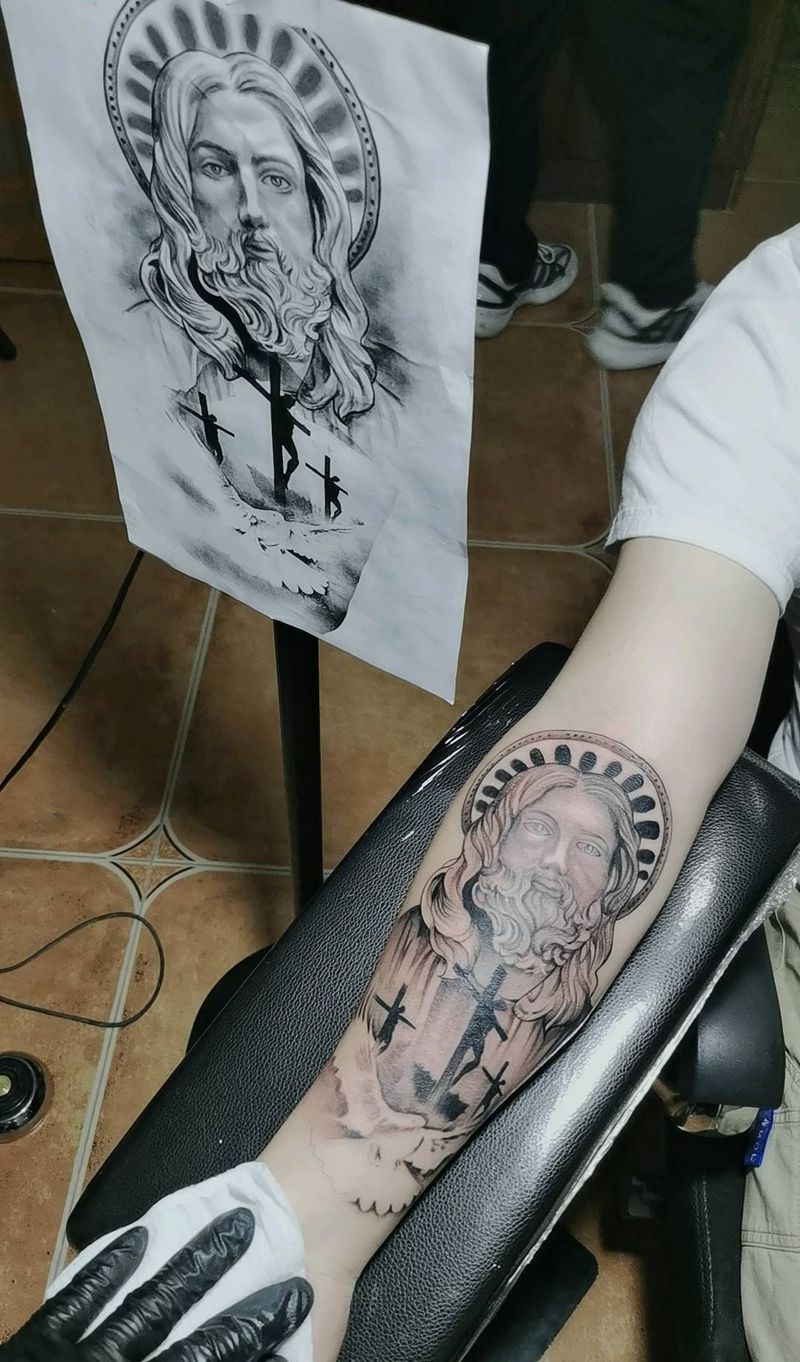 当前位置: 首页 >新疆巴音郭楞蒙古自治州纹身店-鬼斧·tattoo·刺青纹身图案>耶稣纹身图片_手臂欧美写实纹身图案