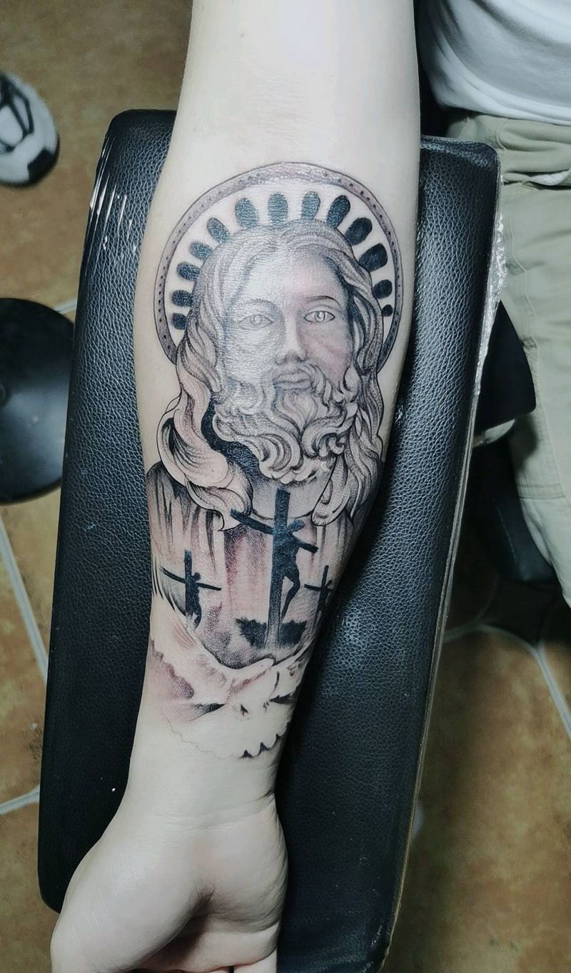当前位置: 首页 >新疆巴音郭楞蒙古自治州纹身店-鬼斧·tattoo·刺青纹身图案>耶稣纹身图片_手臂欧美写实纹身图案