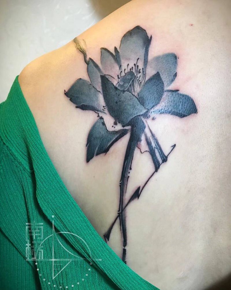 莲纹身图片_成品肩部传统国画清新植物纹身图案