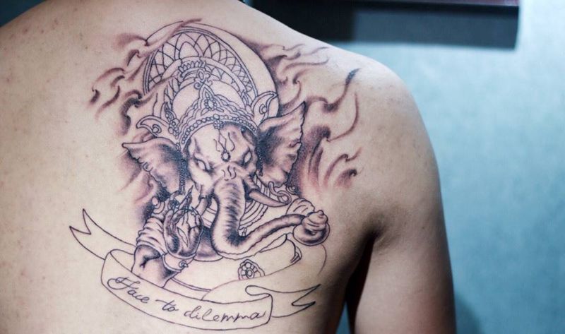 当前位置: 首页 >新疆昌吉自治州纹身店-仰吉刺青纹身图案>象神(半成品)纹身图片_背部动物纹身图案