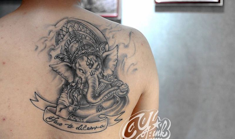 当前位置: 首页 >新疆昌吉自治州纹身店-仰吉刺青纹身图案>象神纹身图片_成品背部传统动物鬼神纹身图案