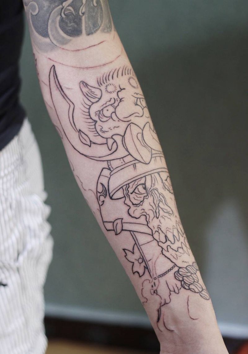 当前位置: 首页 >新疆昌吉自治州纹身店-仰吉刺青纹身图案>鬼武士纹身图片_手臂传统鬼神纹身图案