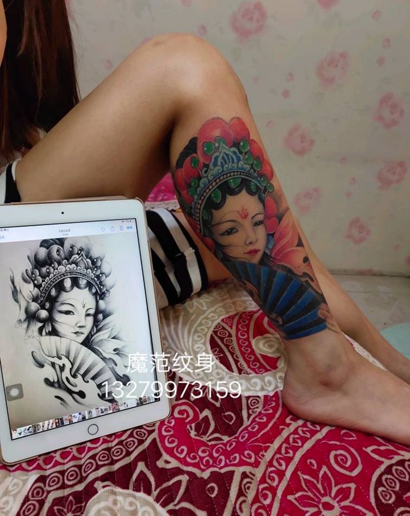 当前位置: 首页 >新疆阿克苏地区纹身店-魔范纹身师工作室纹身图案>花旦纹身图片_腿部手臂水彩新传统花旦纹身图案