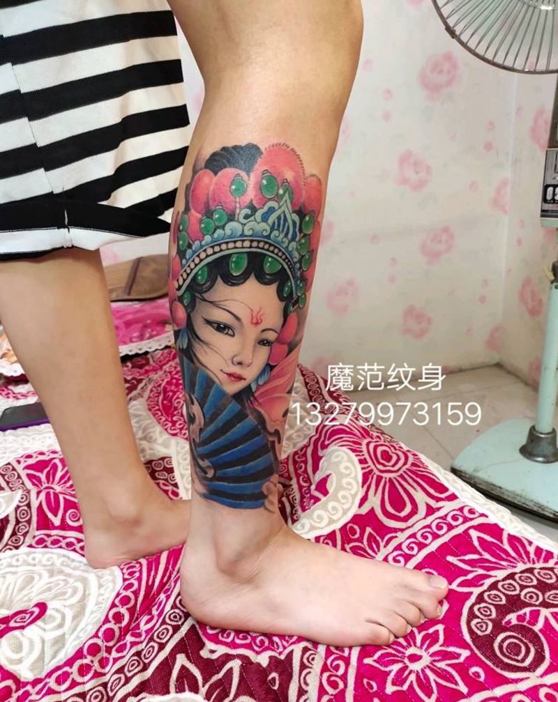 花旦纹身图片_腿部手臂水彩新传统花旦纹身图案