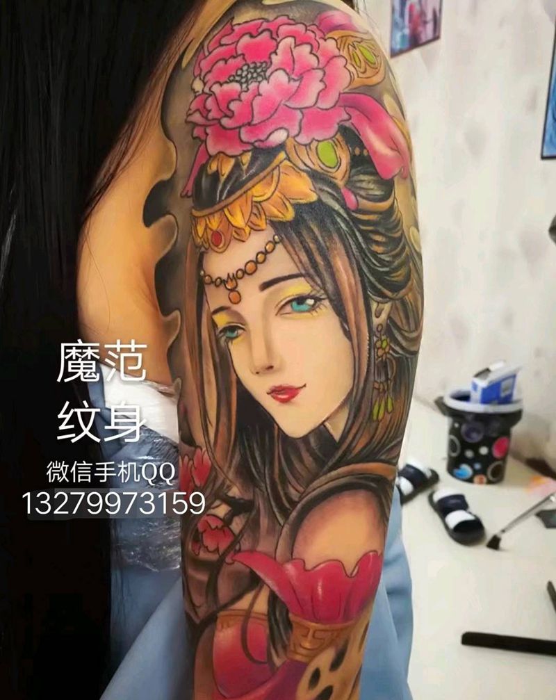 当前位置: 首页 >新疆阿克苏地区纹身店-魔范纹身师工作室纹身图案>艺妓美女纹身图片_肩部新传统艺妓美女古风纹身图案