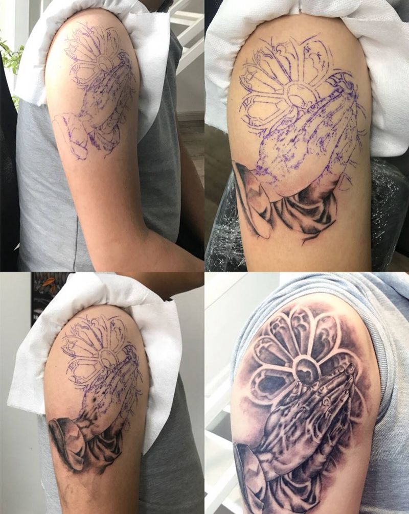 祈福纹身图片_肩部欧美写实成品人物纹身图案