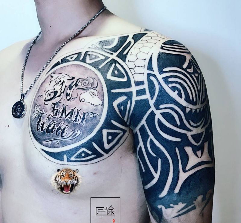 当前位置: 首页 >新疆昌吉自治州纹身店-匠途刺青设计工作室纹身图案>图腾半甲纹身图片_成品肩部胸部背部图腾传统纹身图案