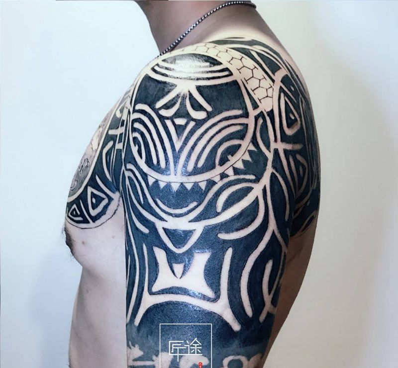 当前位置: 首页 >新疆昌吉自治州纹身店-匠途刺青设计工作室纹身图案>图腾半甲纹身图片_成品肩部胸部背部图腾传统纹身图案