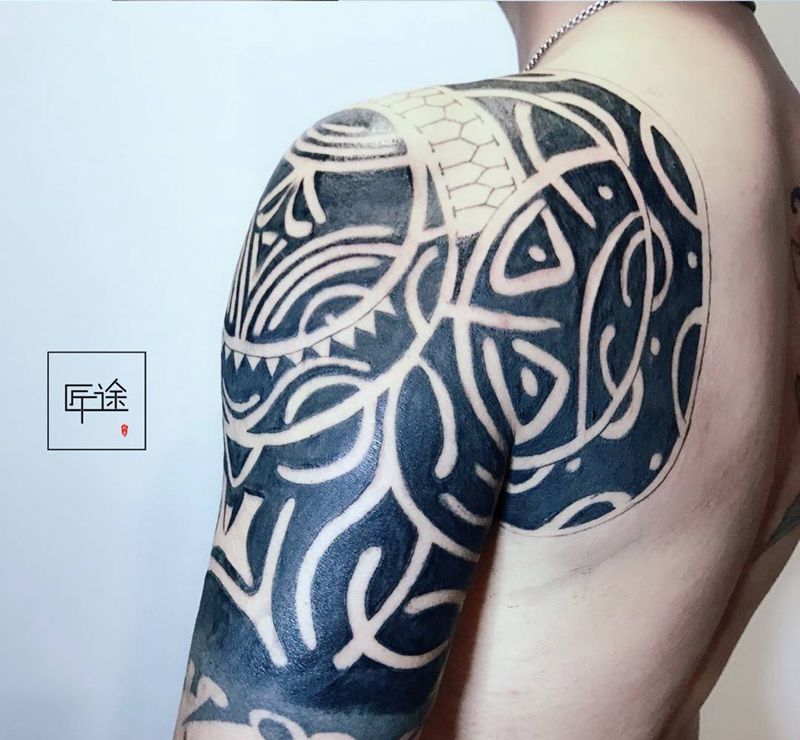 当前位置: 首页 >新疆昌吉自治州纹身店-匠途刺青设计工作室纹身图案>图腾半甲纹身图片_成品肩部胸部背部图腾传统纹身图案