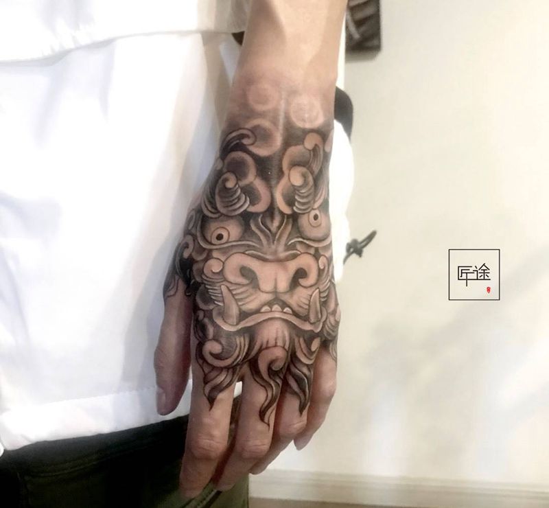 当前位置: 首页 >新疆昌吉自治州纹身店-匠途刺青设计工作室纹身图案>唐狮纹身图片_手部新传统唐狮纹身图案