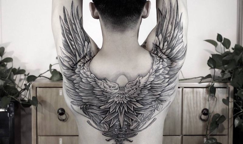 当前位置: 首页 >新疆昌吉自治州纹身店-匠途刺青设计工作室纹身图案>翅膀纹身图片_成品背部肩部手臂写实欧美静物图腾动物宗教纹身图案