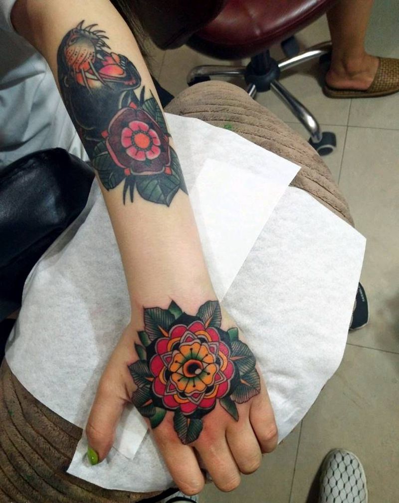 • 手背潮流时尚的玫瑰花眼睛纹身图案
