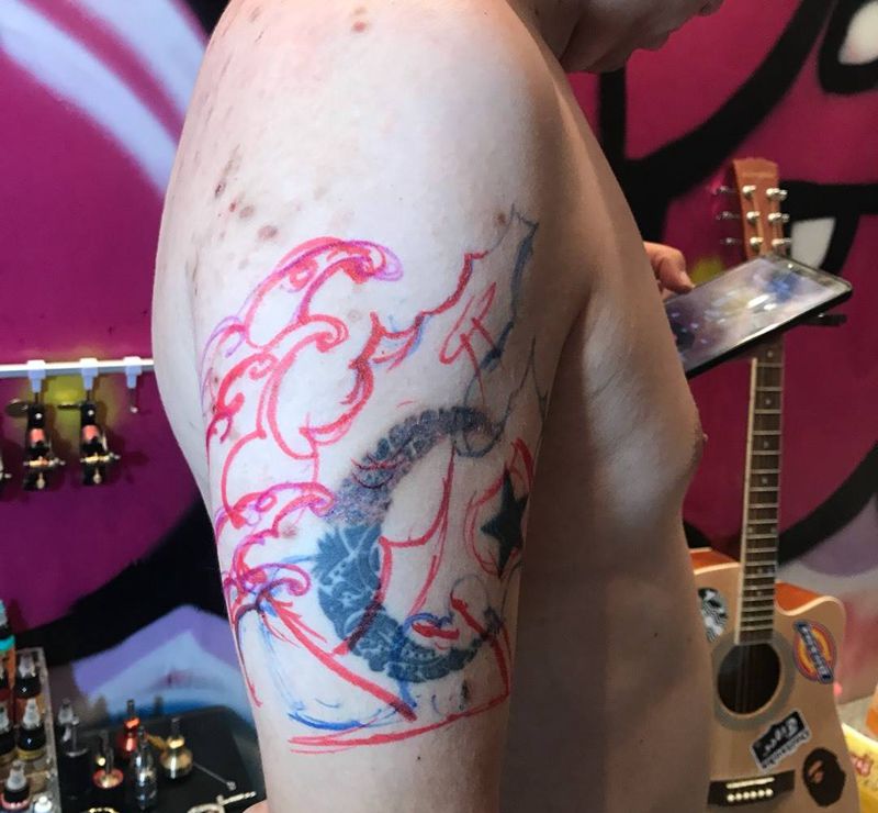 • T网红王老大花腿龙纹身图片_腿部新传统纹身图案
