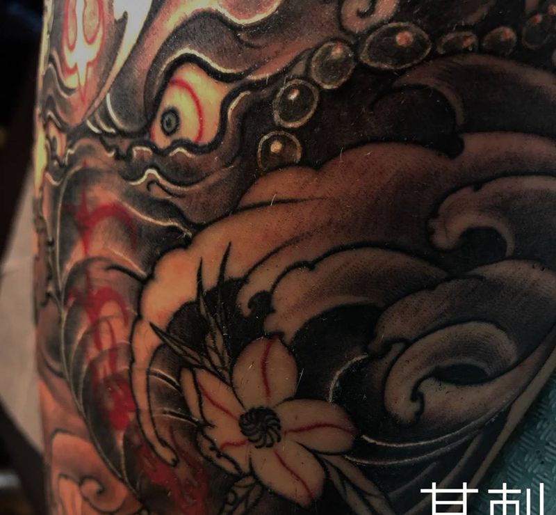 • T网红王老大花腿龙纹身图片_腿部新传统纹身图案