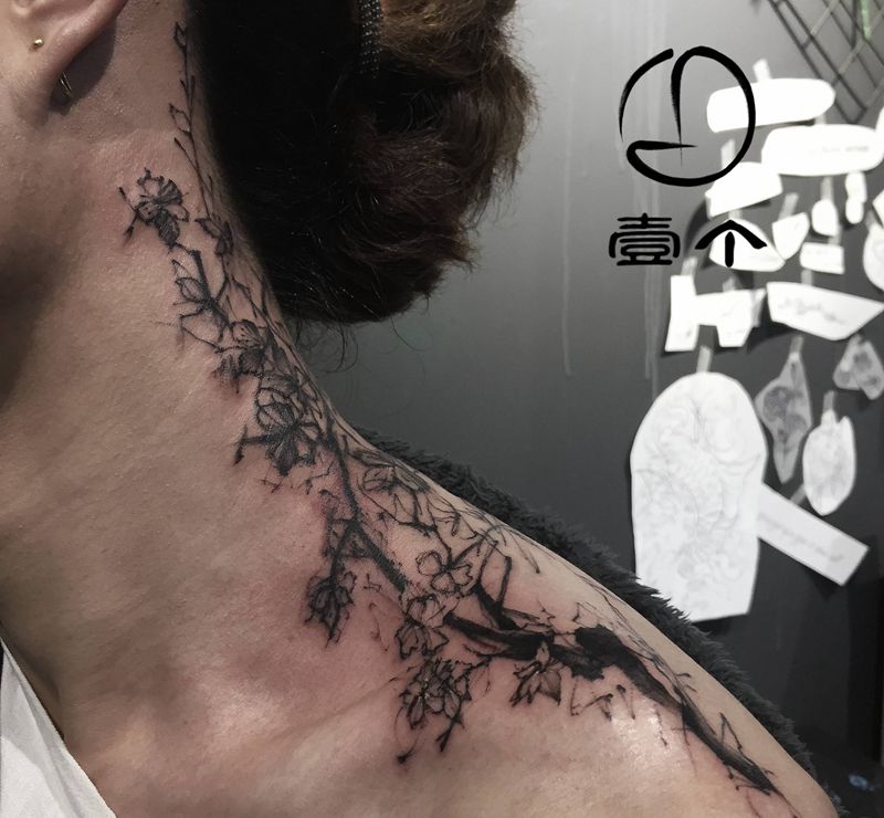 当前位置: 首页 >新疆伊犁哈萨克自治州纹身店-荼刺青墙绘工作室纹身图案>花纹身图片_颈部水墨点刺黑纹身图案