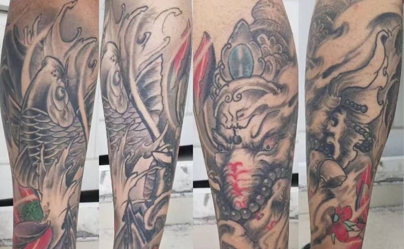 • T网红王老大花腿龙纹身图片_腿部新传统纹身图案