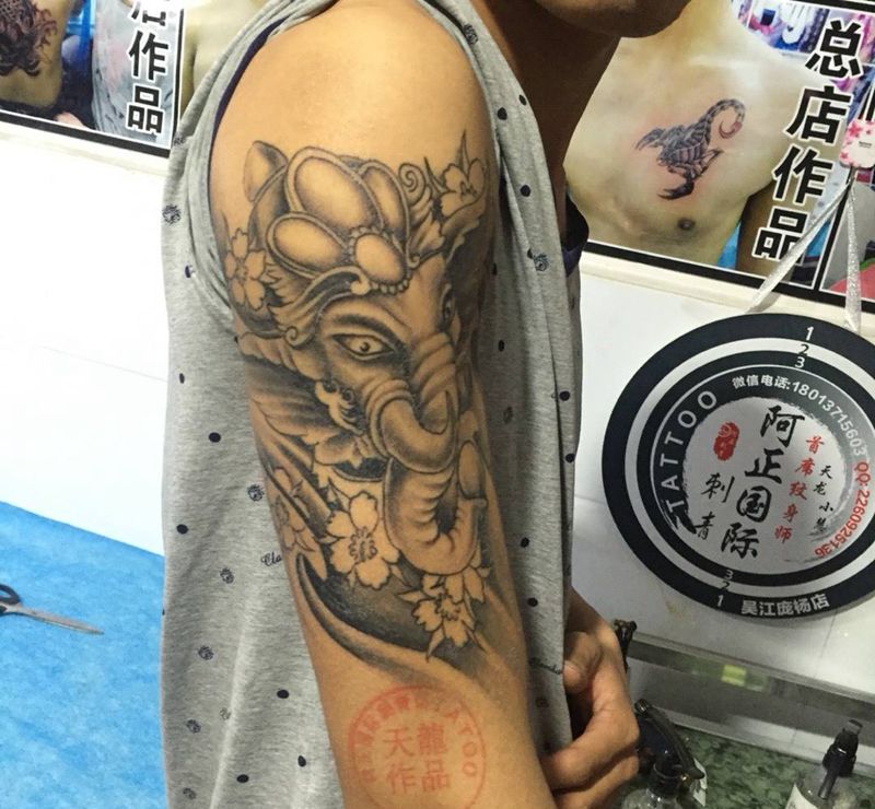 当前位置: 首页 >江苏省苏州市纹身店-阿正总店国际3D刺青店纹身图案>手臂象神纹身图片