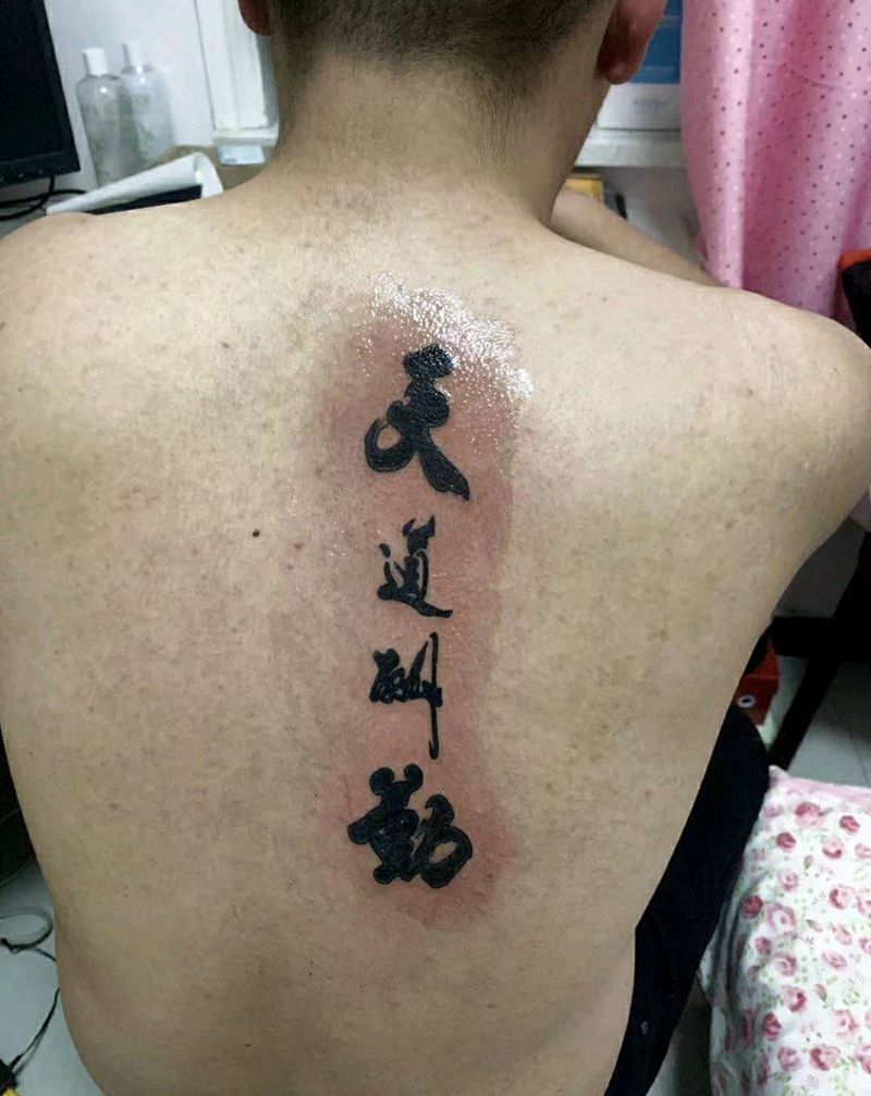 天道酬勤纹身图片_背部肩部水墨书法字体纹身图案
