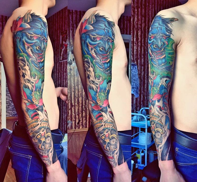 当前位置: 首页 >新疆直辖纹身店-陵鱼纹身工作室纹身图案>花臂 配色客人要求的纹身图片
