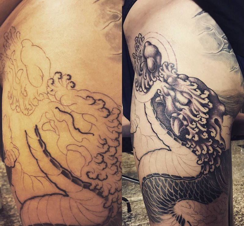 • T网红王老大花腿龙纹身图片_腿部新传统纹身图案