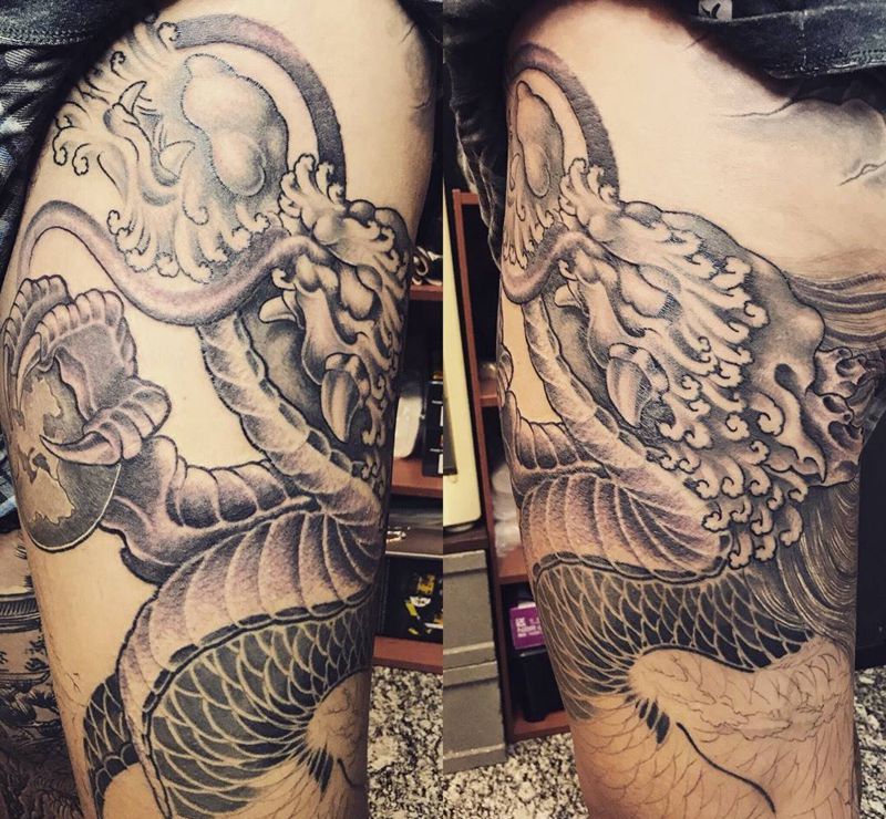 • T网红王老大花腿龙纹身图片_腿部新传统纹身图案