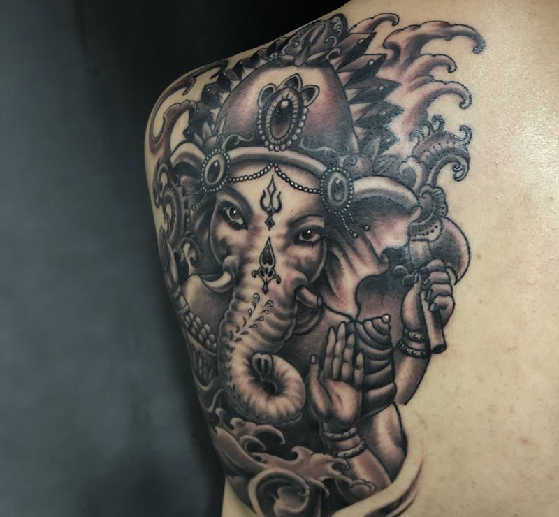 当前位置: 首页 >贵州省贵阳市纹身店-穿青纹艺纹身图案>象神纹身图片_背部新传统纹身图案