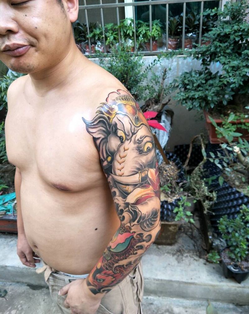 当前位置: 首页 >贵州省贵阳市纹身店-穿青纹艺纹身图案>象神鲤鱼花臂纹身图片