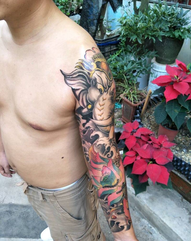 当前位置: 首页 >贵州省贵阳市纹身店-穿青纹艺纹身图案>象神鲤鱼花臂纹身图片