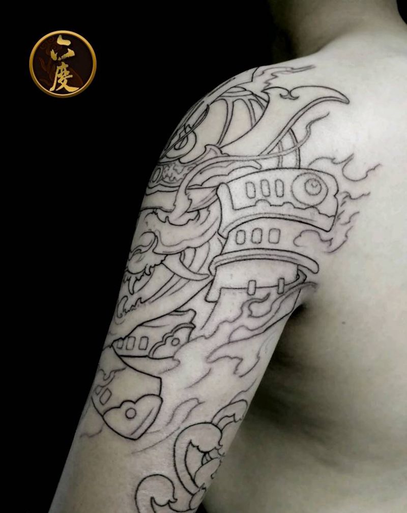 当前位置: 首页 >内蒙古赤峰市纹身店-六度刺青纹身图案>菊花鬼武士线纹身图片
