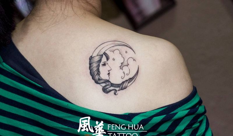 花肩纹身图片_肩部背部点刺水墨花纹身图案