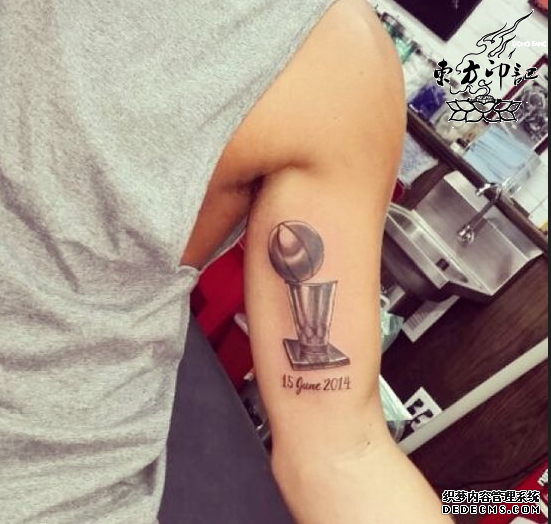 在刚刚结束的NBA2014-14赛季中,圣安东尼奥马刺队夺得了最终的冠军,在获得胜利的同事,马刺球队的后卫球员马科·贝里内利为此新添了一个新的纹身,纹身图案是冠军奖杯的样子。